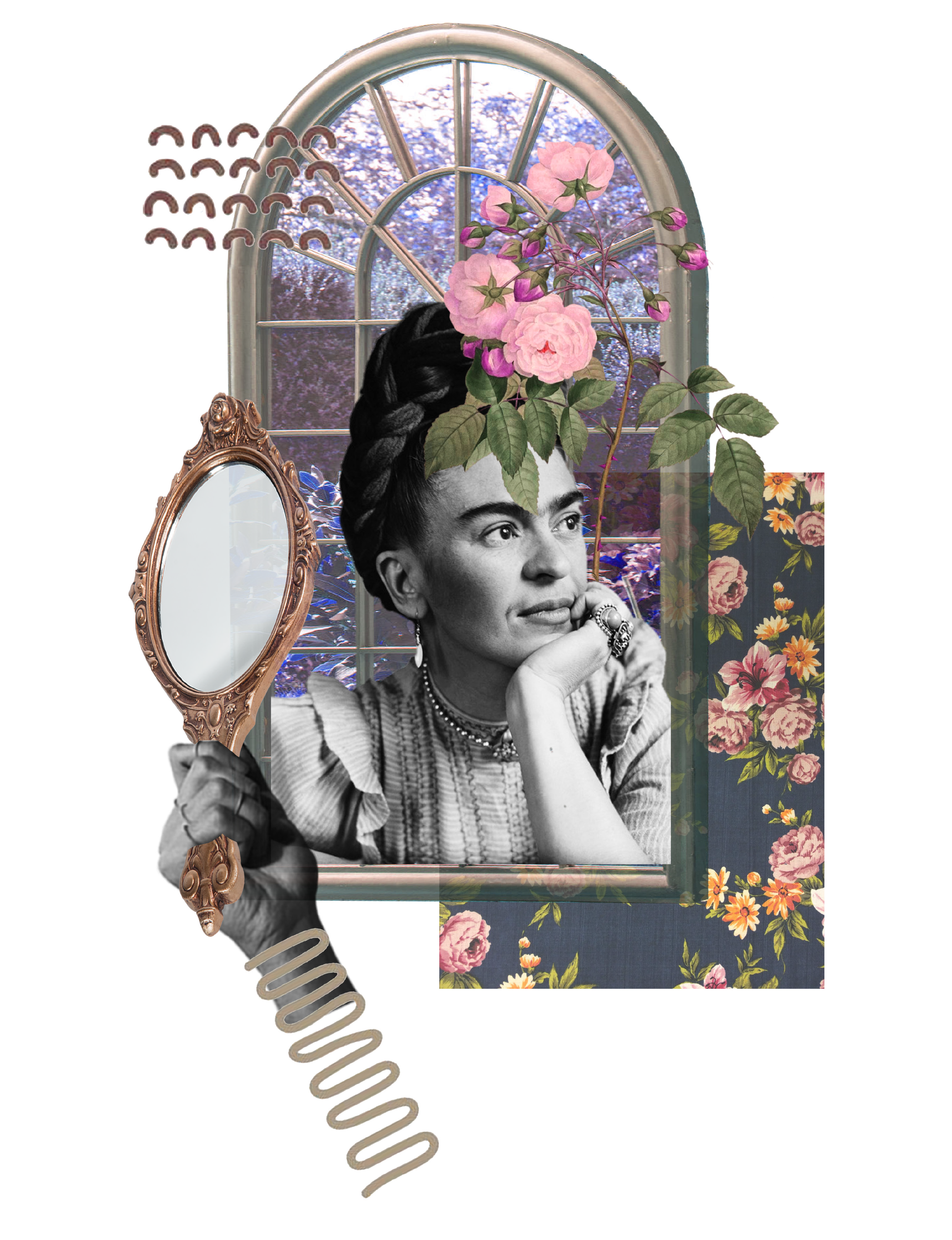 She enjoys communicating in digital collages! This concept collage was made as part of her design for an exhibition on Frida Kahlo.