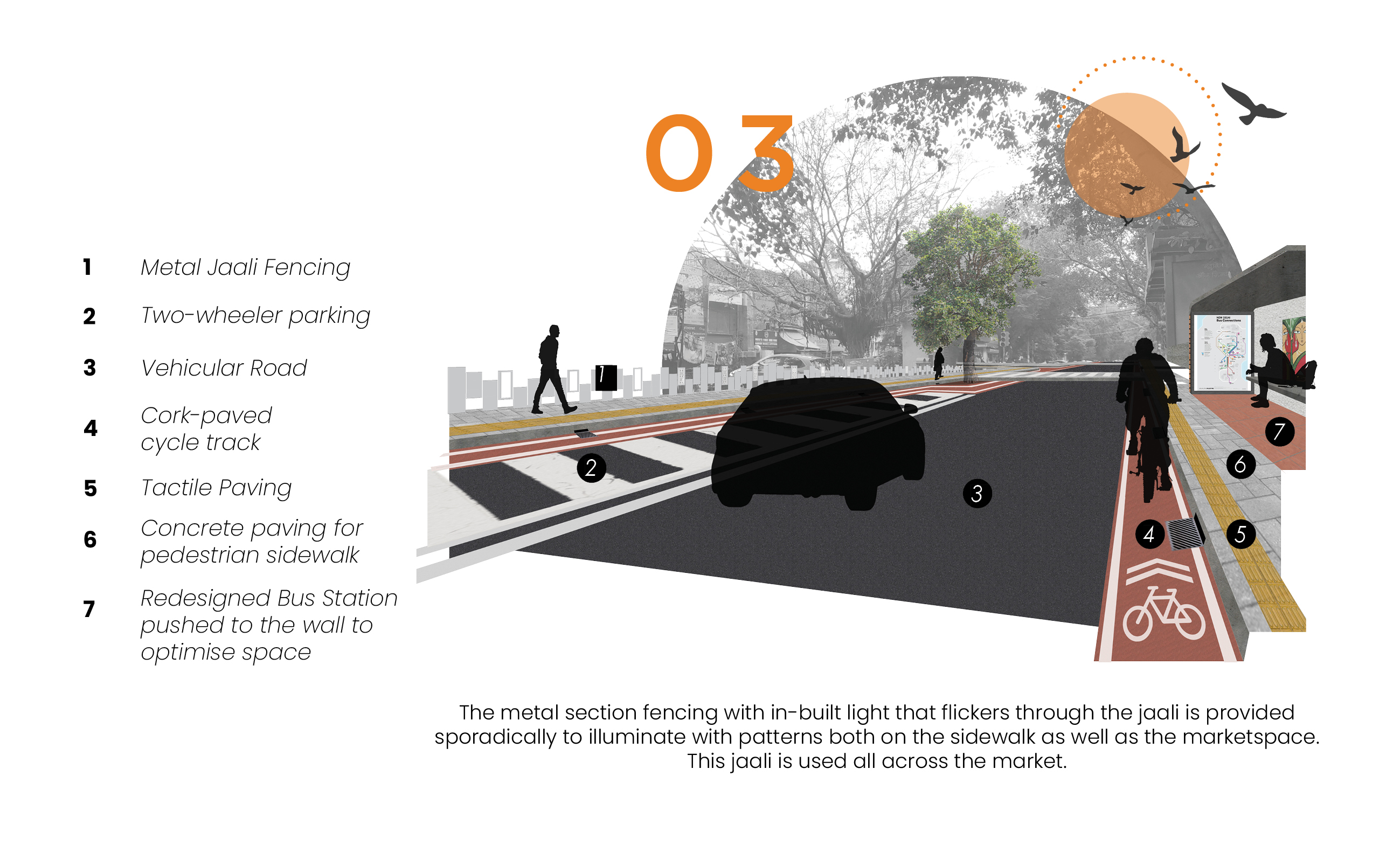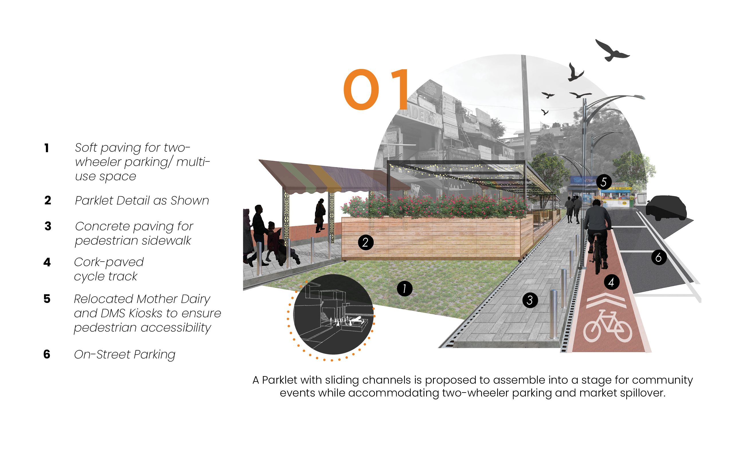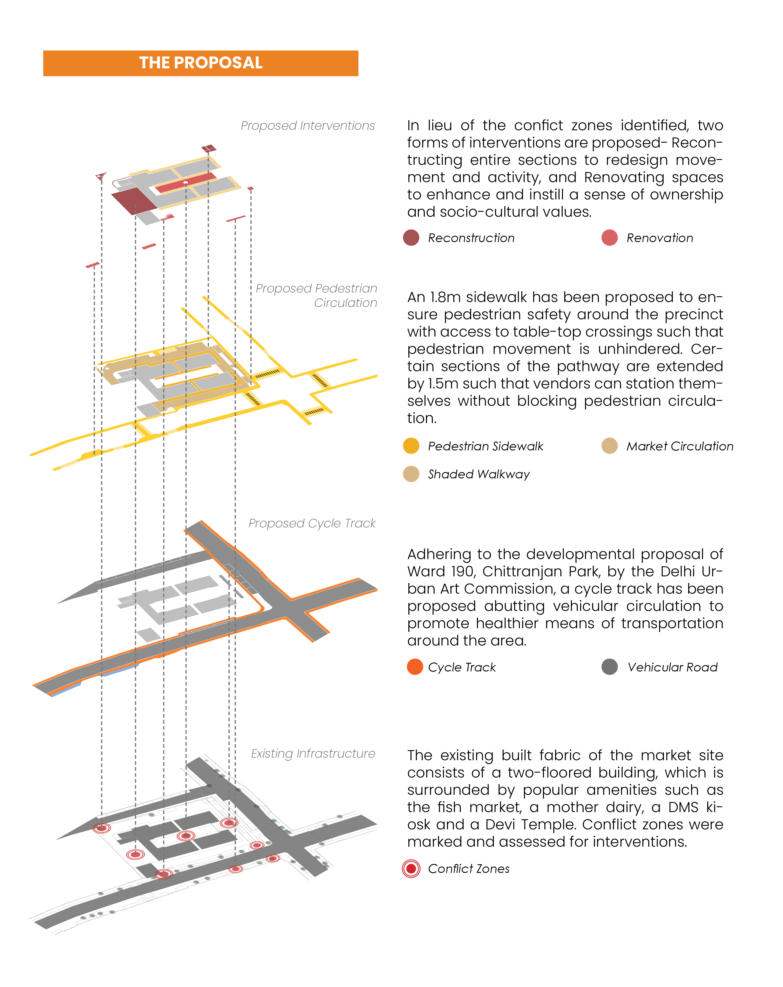 After thorough site and contextual studies, and by drawing inspiration from Rabinadranath’s thought provoking essay, “City and Village” (1924), wherein he described the life on the moon whimsically as being a “constant festival of colour, music, movement”, we sought to redevelop the Market such that the individual quality, character and style could allow the shop owners, street vendors and social spaces the socio-cultural flexibility to express the free spirit of Chittaranjan Park. The urban strategies thus proposed also envisages a framework for the city to ensure accessibility, safety and liveability.