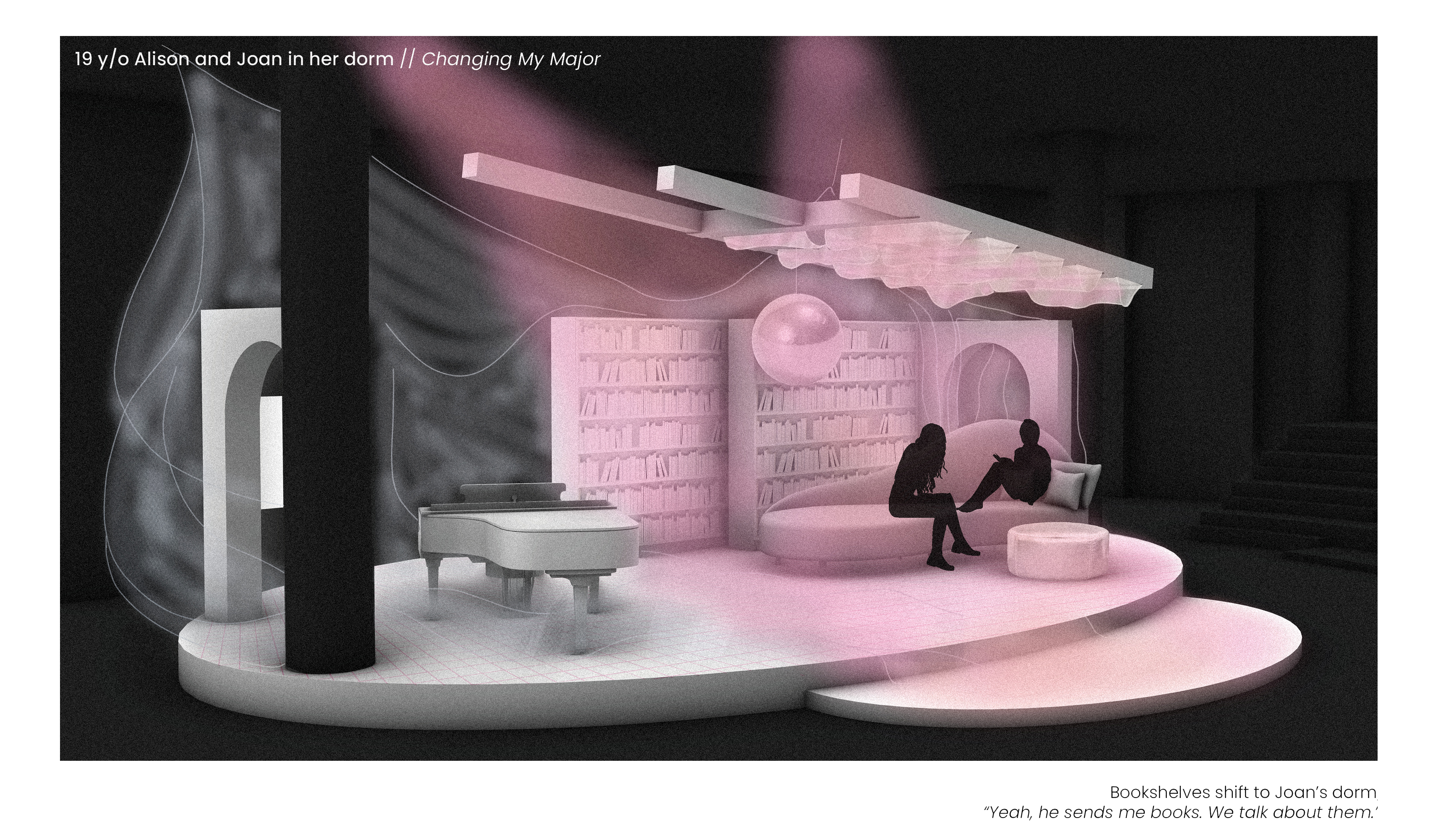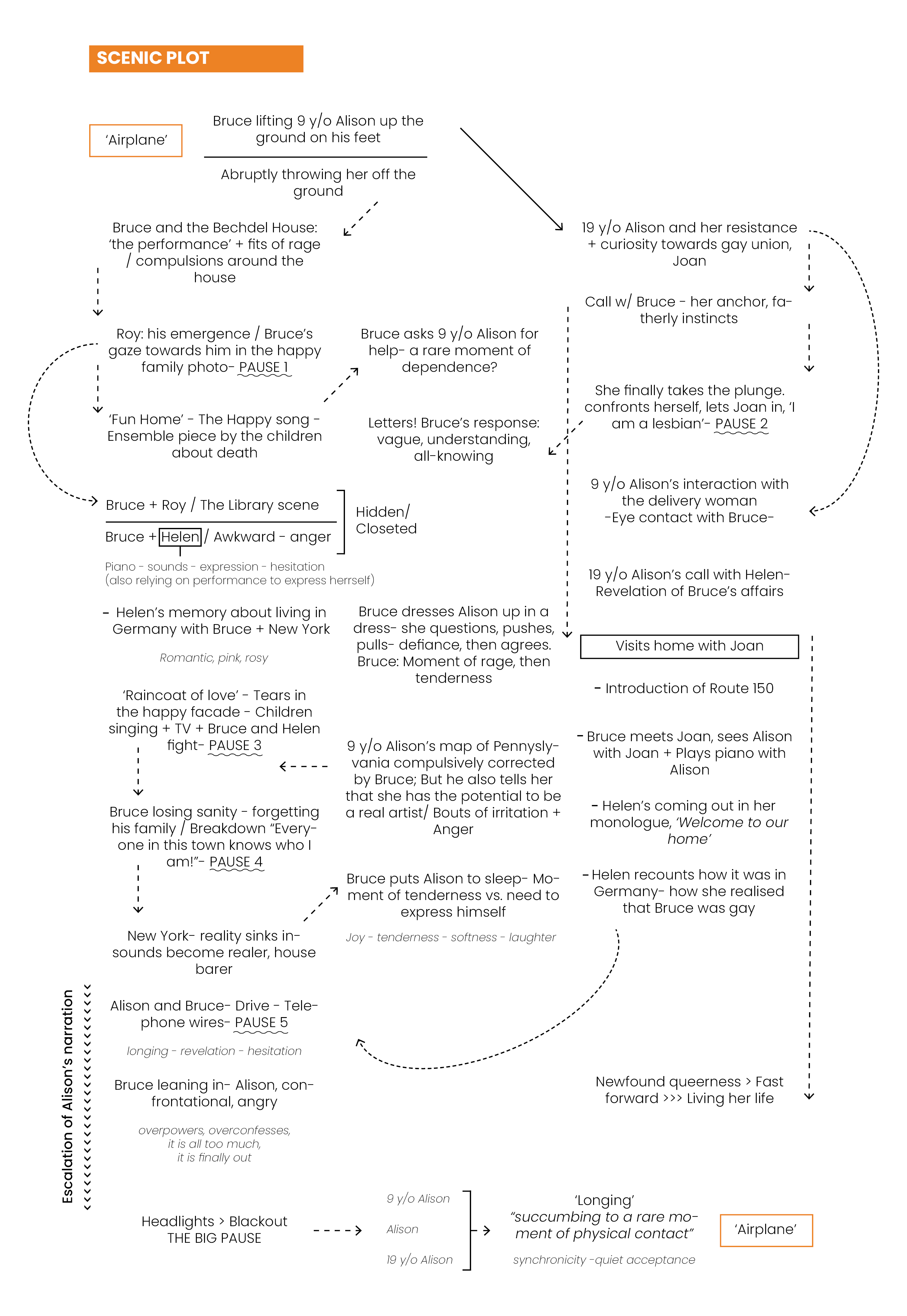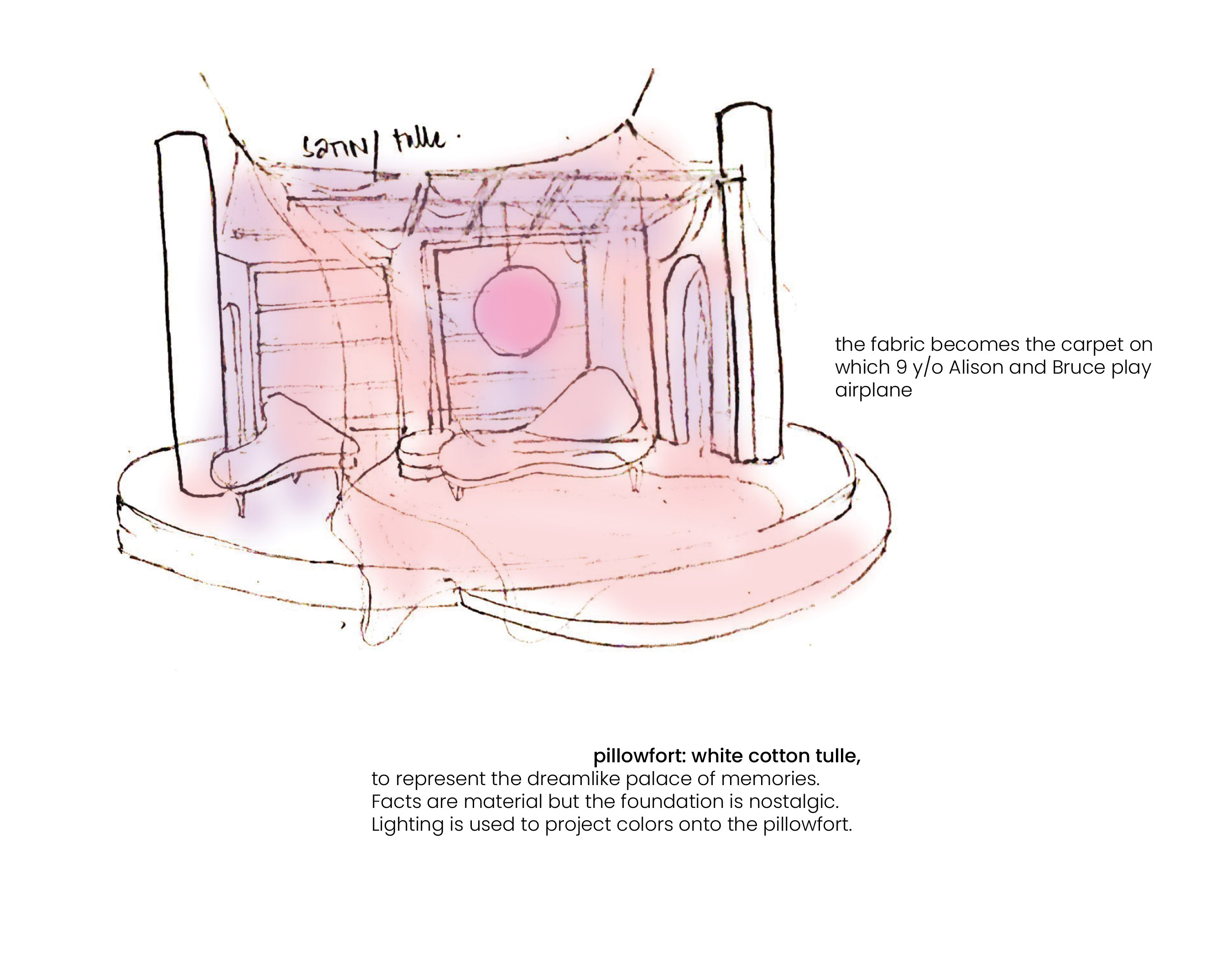 Several readings of the text prompted focus on the relationship shared between Alison and her father through her memories which then formed the foundation of the set design with the introduction of pillowfort.