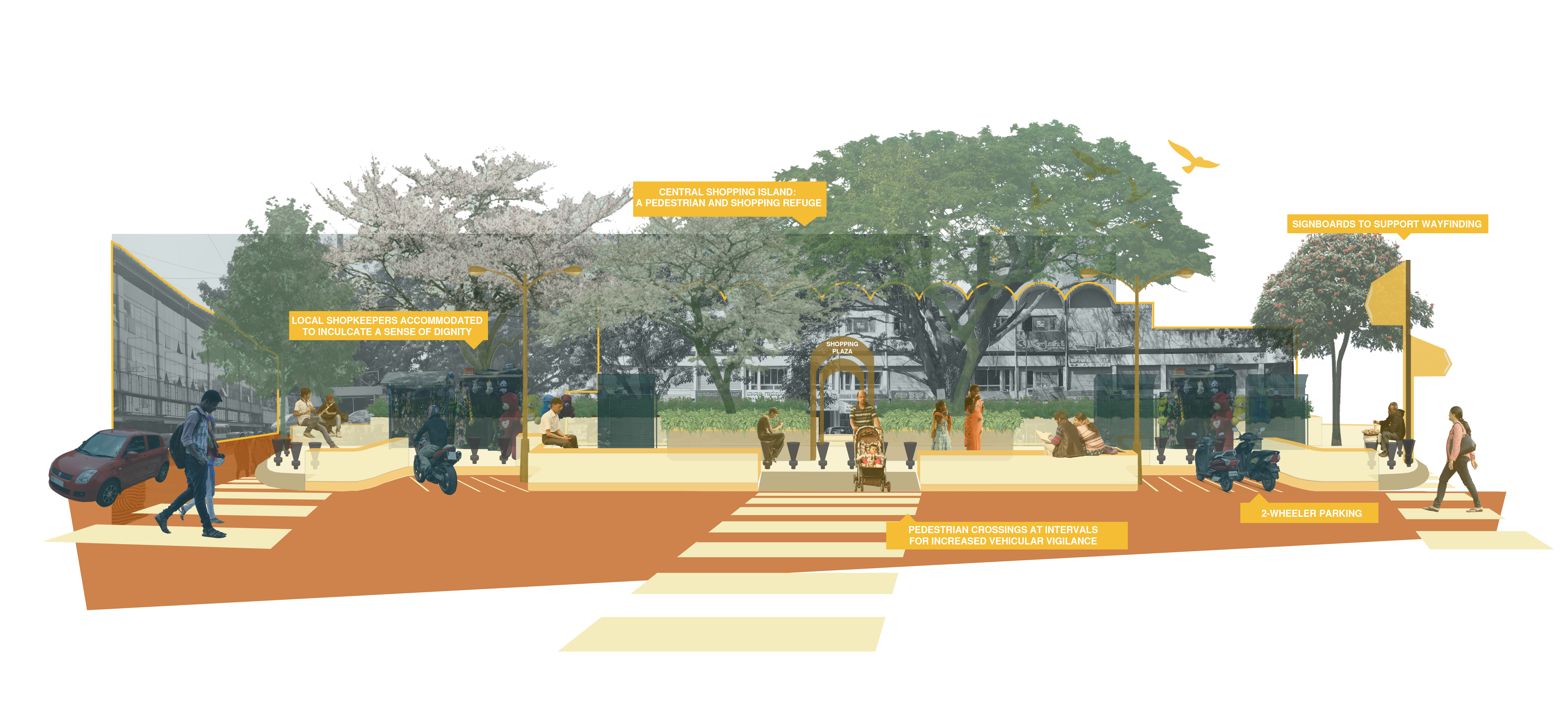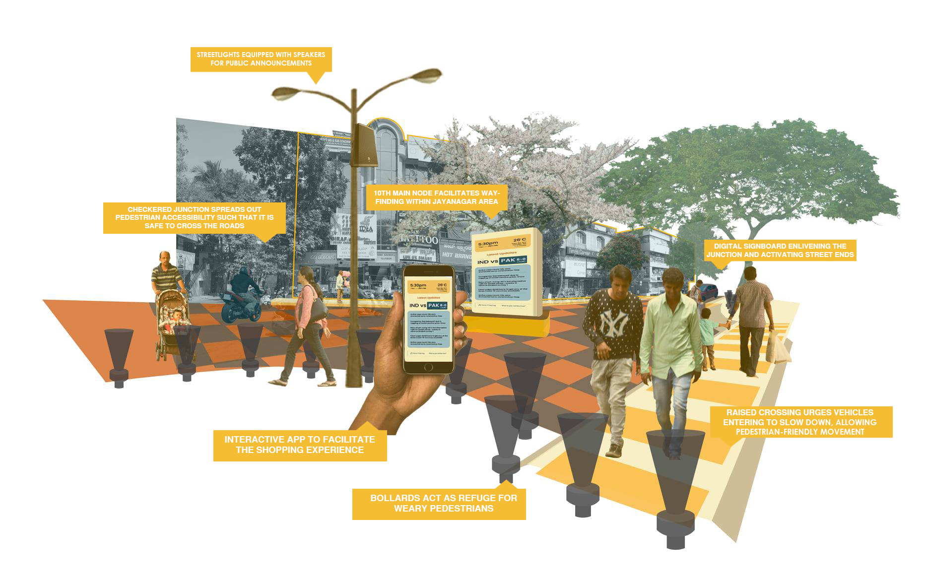 10th Main Road in Bangalore has long boasted of a bustling street life, owing to its vibrant commercial landscape spread across the distinguishable Jayanagar Shopping Complex. The existing patterns of usage makes for a very vibrant and complex co-dependent ecosystem of vendors, buyers, residents and visitors. However, the culmination of rampant urbanisation, traffic, commercial exploitation and vandalisation of commercial property has drained a few shades of its rich color. After thorough site and contextual studies, the urban strategies thus proposed also envisages a framework for the city to ensure acessibility, safety, walkability, socio-cultural flexibility and livability.