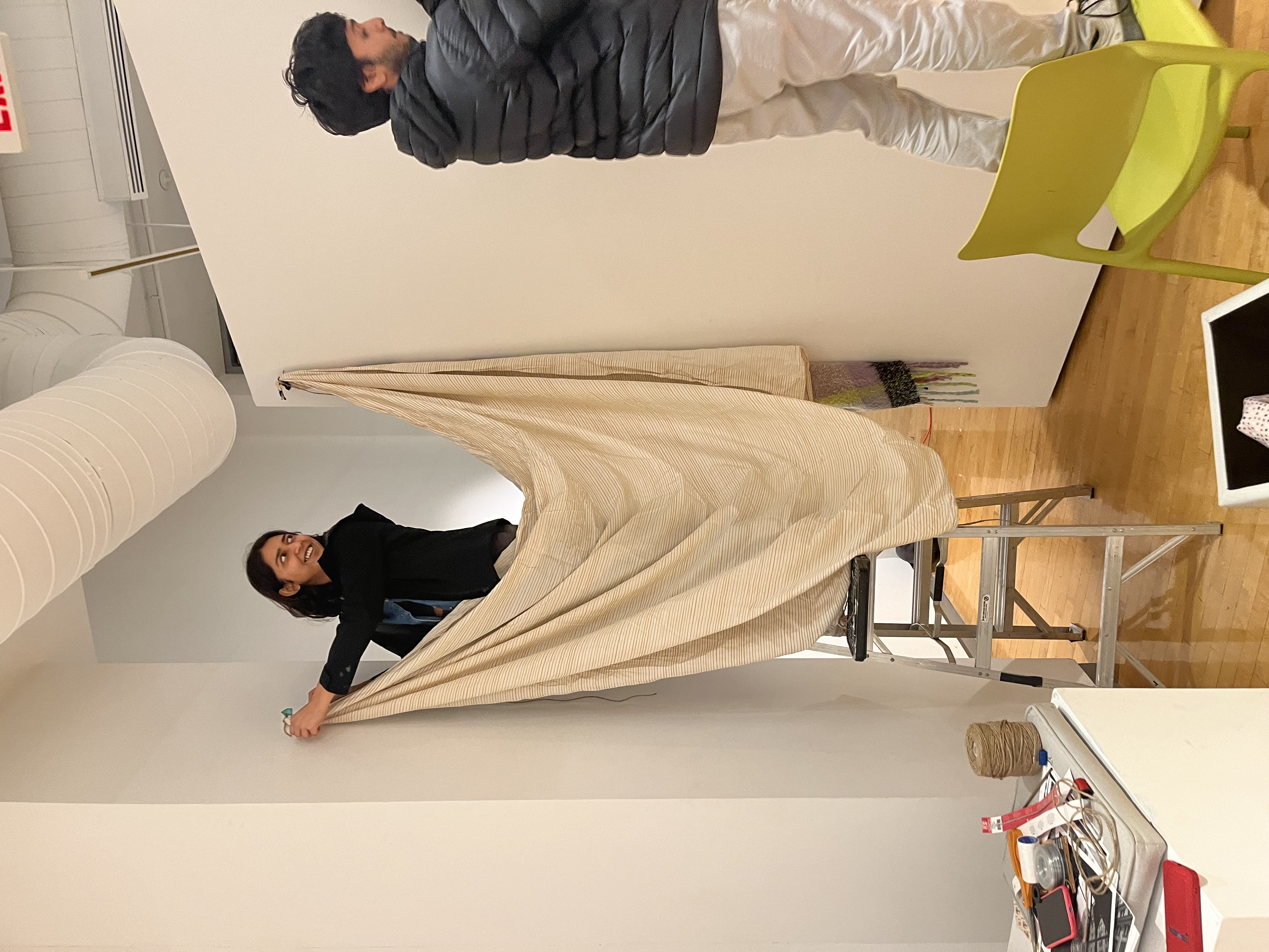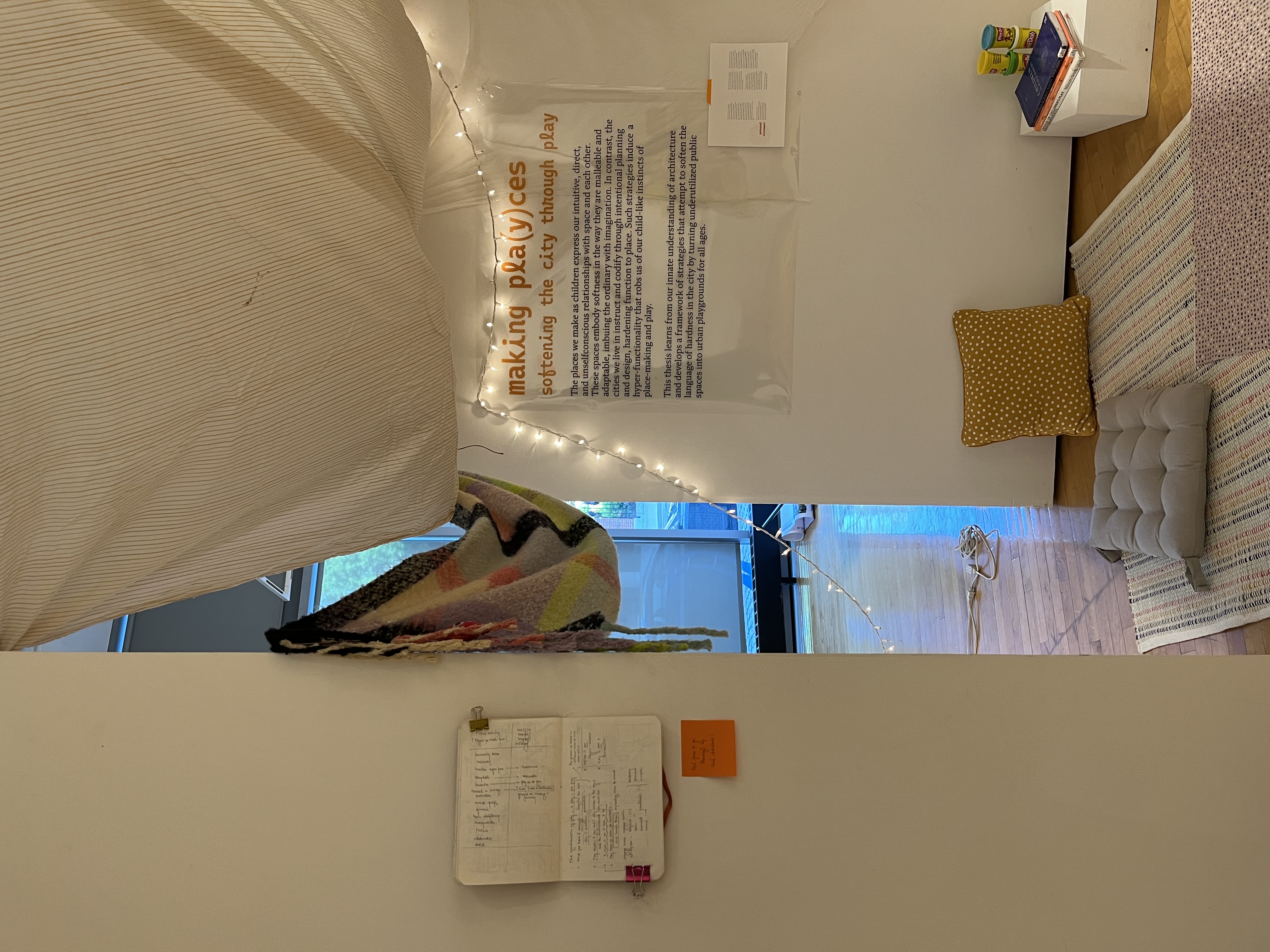 The intention with building a pillowfort for the final presentation was to soften the seriousness of the environment of a thesis review. A small alcove was built by positioning a partition wall at an angle to my presentation wall and draping bedsheets and found fabrics from the ceiling. The space was made cozier with cushions, carpets and fairylights. This created a nook for anyone to sit and make their own.